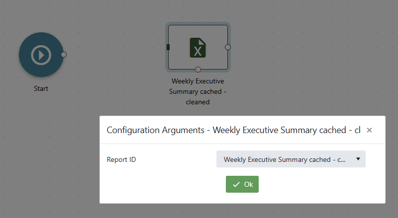 Because you drag in a specific report into the workflow, the required report ID is already configured, but if you hover the node and click the "gear" icon, you can select a different report to run. Note how the parameters change when you select a different report.