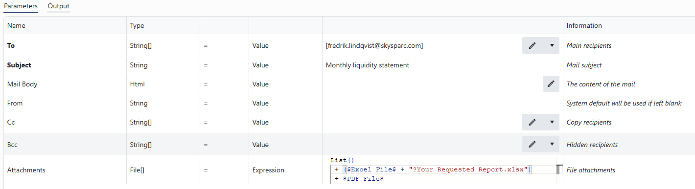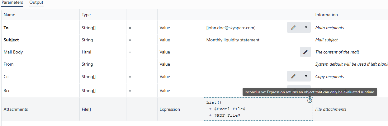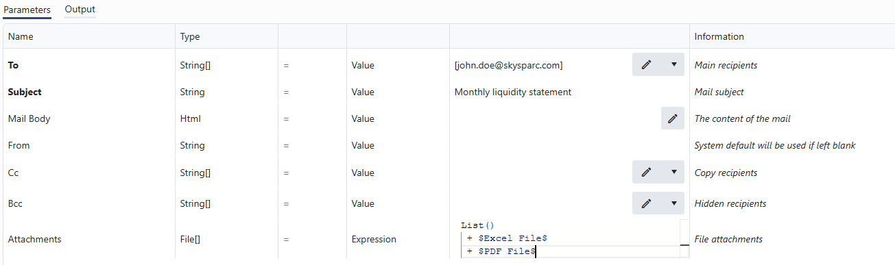 Another data type that _can be used in expressions is File. As shown previously, file arrays can be created using expressions and used e.g. as attachments to email combining the List()function and referencing file variables.