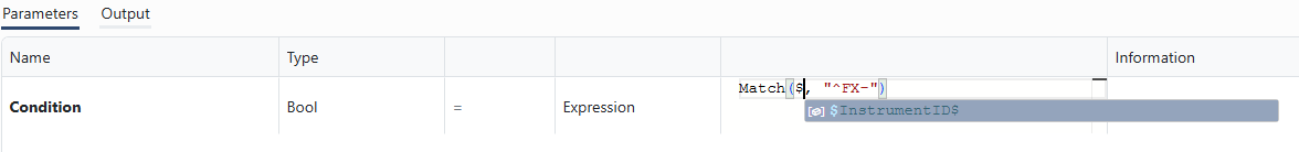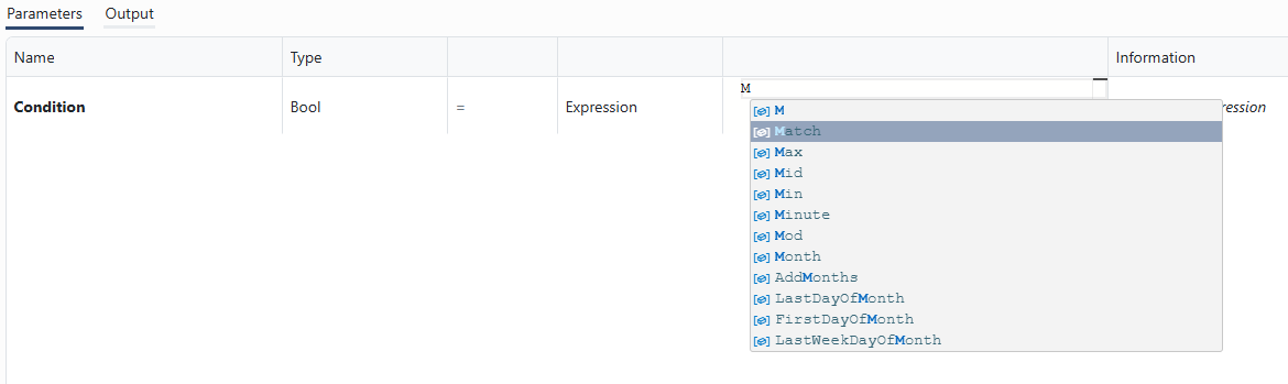 The expression language used is the OmniFi expression language used in the Calculated Columns modifier, and in various places in Autotest and the Web portal. While the OmniFi expression language is case-insensitive, the function suggestion box can be opened by typing an upper-case character: