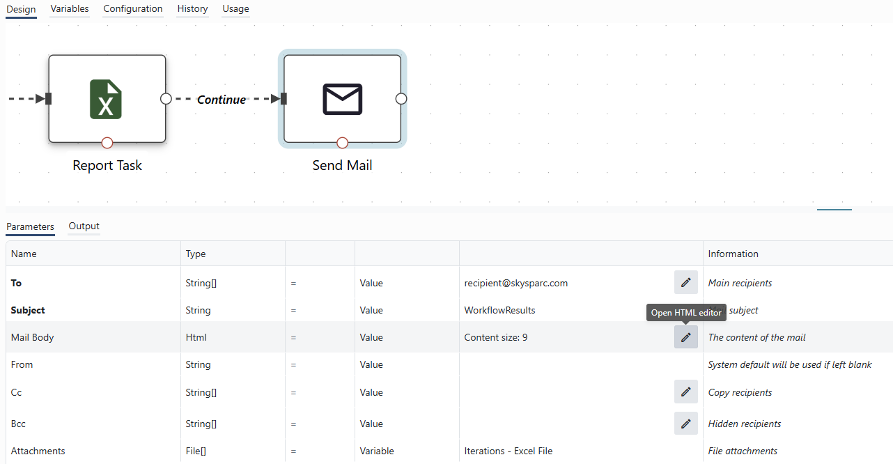 Example of a Send Mail node execution. The "Open HTML editor" button of the parameter Mail Body is highligted. Parameter Attachments takes a variable as input where the variable holds the output of a Report Task execution, which is a list of Result files from each of the task's iterations.