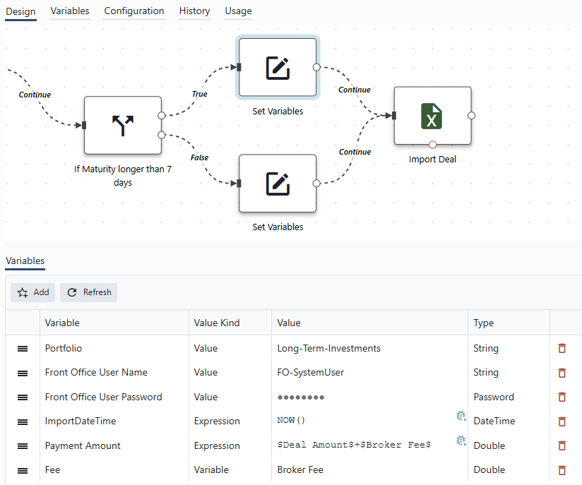 Example of a Workflow that imports a deal. The Set Variables nodes are used to set variables based on the conclusion of the If node in the previous step. The If node evaluates if the Maturity of the deal to be imported is longer than 7 days. If the node resolves to True, the Portfolio will be set to "Long-Term-Investments", which would contrast the Portfolio set if the False path would have been followed. Five additional variables are also set: user name, password and import time stamp are provided as values on the node. Payment Amount and Fee are populated based on previously known variable values.
