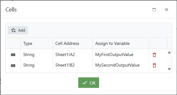 Cell Configuration window. The values of the two cells Sheet1!A2 and Sheet1!B2 will be saved to the variables MyFirstOutputValue and MySecondOutputValue upon node execution.