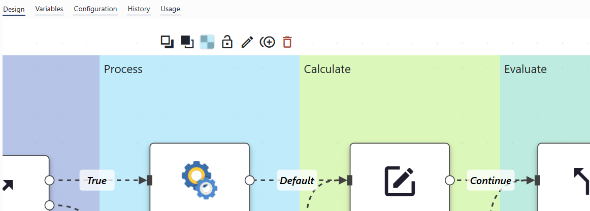 Picture showing a set of Workflow nodes where four Note nodes have been used to create colored and descriptive sections, thereby classifying the roles and purposes of the other nodes placed on top. The menu bar of the blue Note is visible above it.