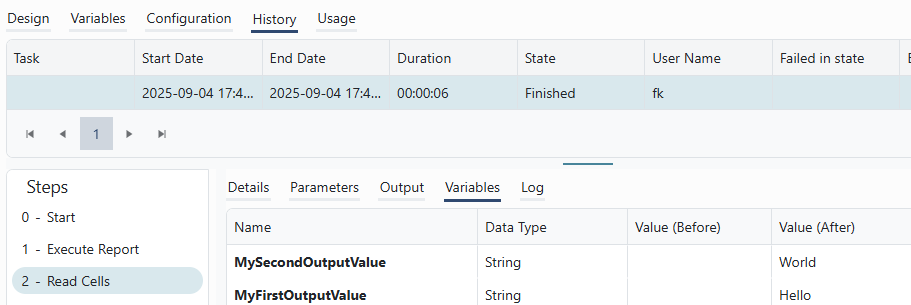 The values held by the variables may be viewed in the History tab under the Variables section. In the picture, we see that the values held by variables MyFirstOutputValue and MySecondOutputvalue changed from null to "Hello" and "World" on Step 2.