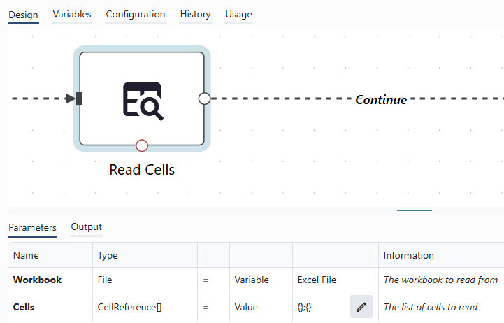 Parameter Workbook inputs the value of variable "Excel File". This variable contains the Result File from a previous Report Execution. The button with the symbol of a pen opens the Cells Configuration window where one configures which workbook cells to read data from.