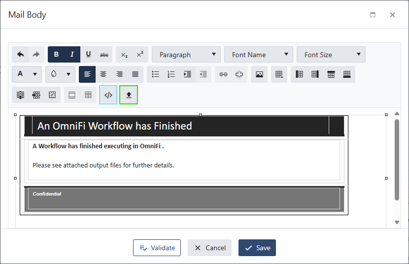 Parameter Mail body is of Type Html. The mail body may be designed in the Mail Body HTML Editor, either by writing HTML code or by using available configuration buttons.